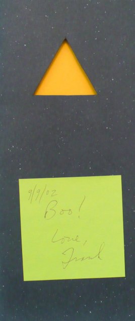 Two tiny triangles (just about that size) on the tummy, four in the morning, April 19th, 2002. Both pointing to the left. In a dream later: the infinite space of them: Sengai floating in and out. Plato’s creek overflowing. Shelley’s women capturing kisses in nets. Kiss enough: one shouldn’t yearn for low damages too soon- damage in the sense of wobbly chakras.